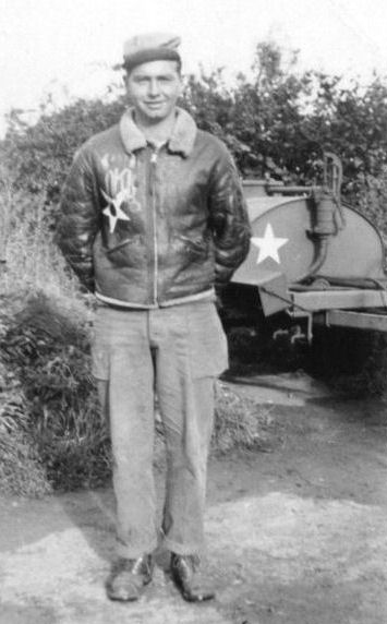 On one German raid, a B-24 near the 1825th barracks was hit and was burning. A fuel truck had just pulled up to the plane. The truck driver lost no time in getting out of the truck and running as fast and as far as possible.